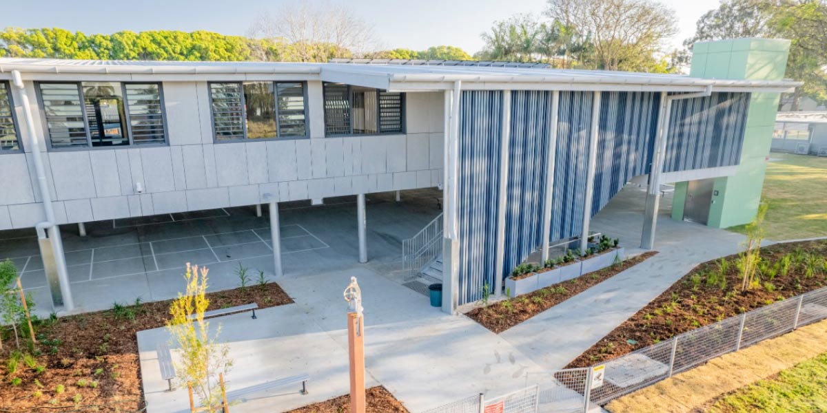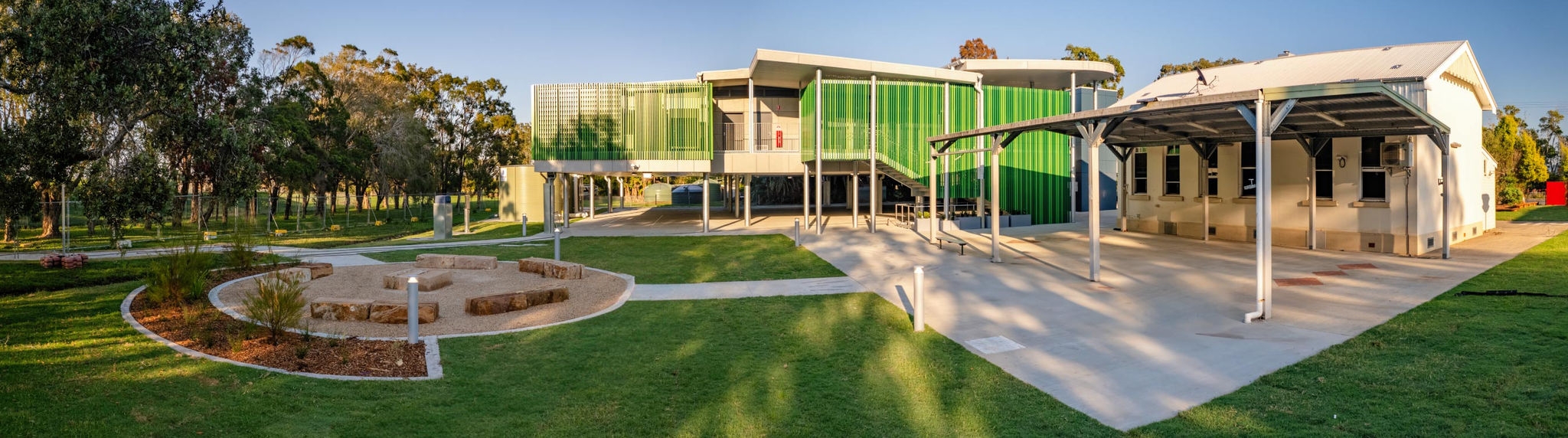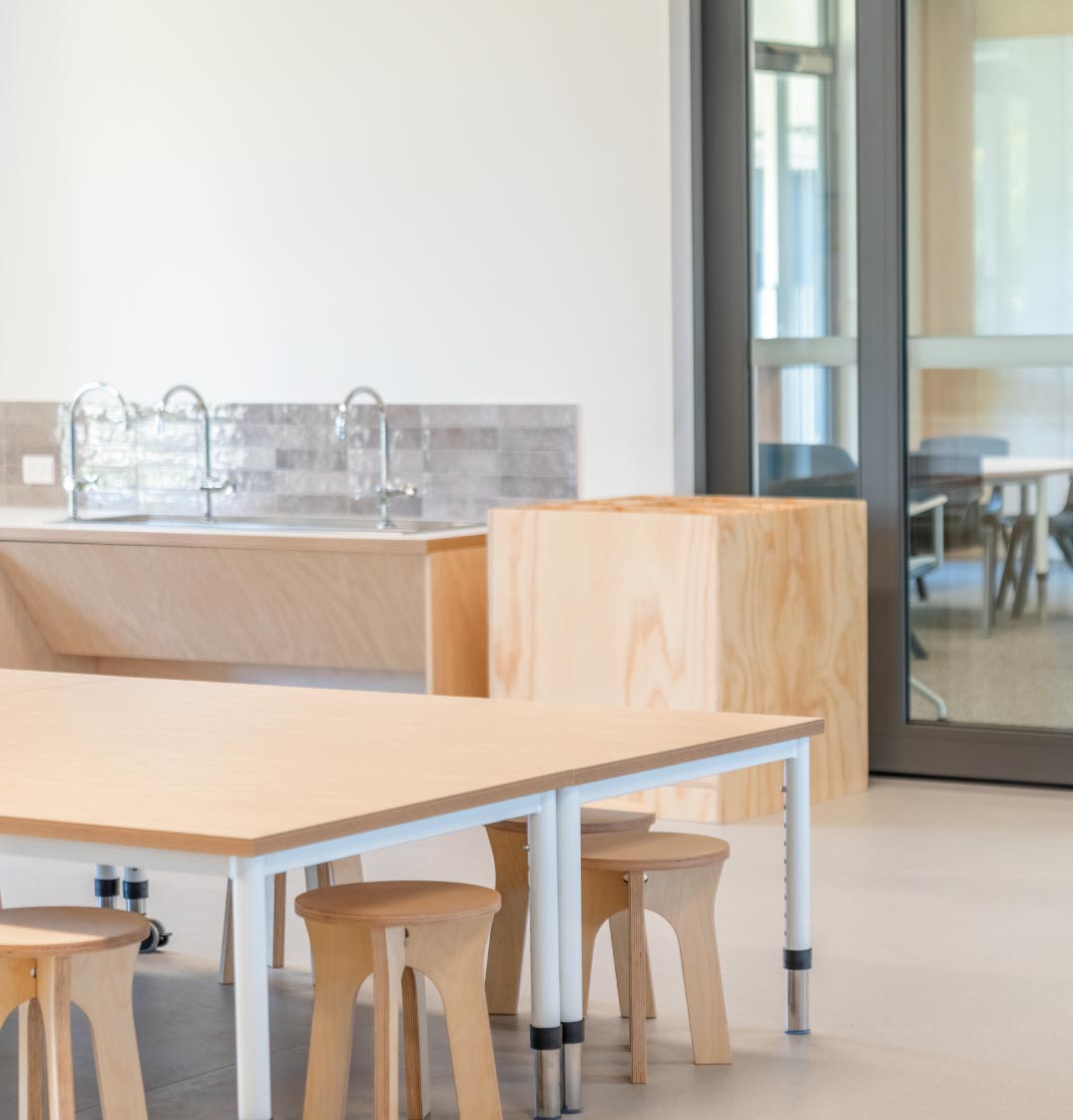 Pedavoli Architects’ design included raising the classroom and other core facilities o the ground on a steel structure. They used resilient materials throughout and designed downstairs amenities that are easy to clean and restore if submerged under water. The space beneath the school structure serves as a versatile area that maximises land use by providing a sheltered environment for students. By using this space eectively, the school not only enhances the recreational experience for students but also ensures that every inch of the property contributes to the overall functionality of the campus. This thoughtful design fosters a dynamic and adaptable environment that supports both play and learning.